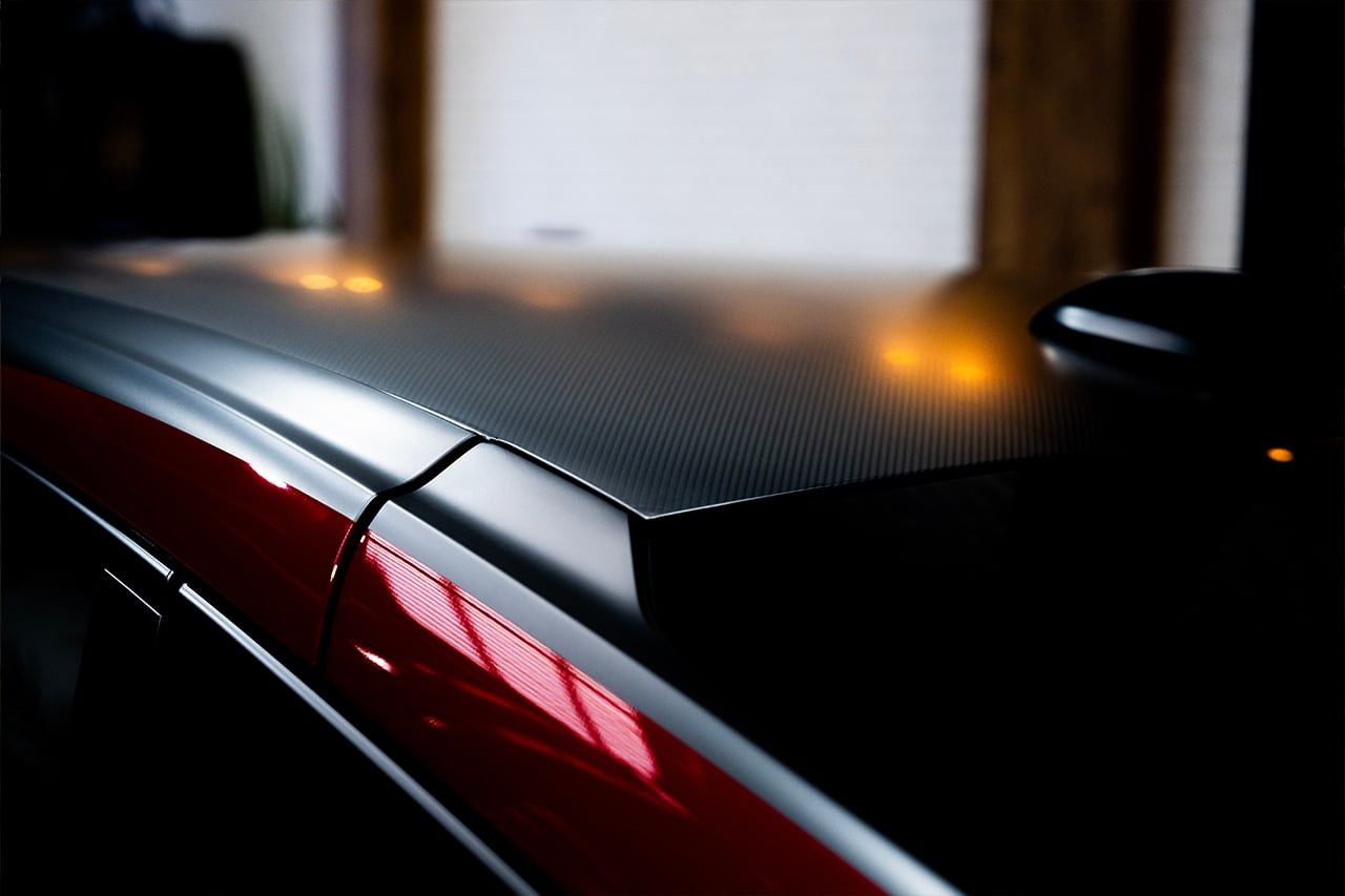 マットセットに加え、ルーフ部をリアルカーボン柄のプロテクションフィルムを使いマットトーンのカーボンに。
